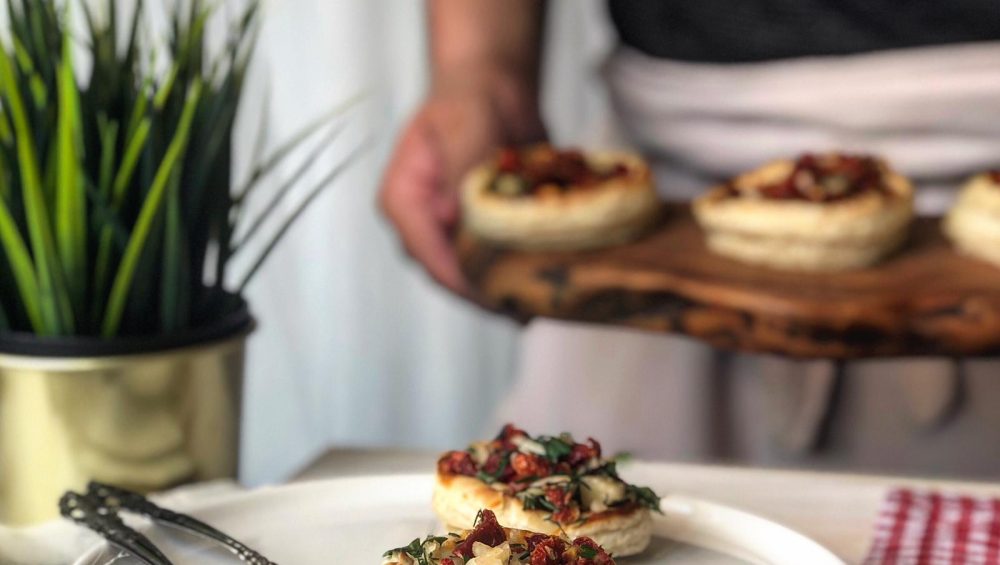 * Derin bir kapta minik minik doğradığımız kuru domatesleri, peynirleri , dereotu ve maydonozu karıştırıyor zeytinyağı ilave ediyoruz. Bu karışımı fırından aldığımız çanak şeklindeki milföylerin içine dolduruyoruz. Sonra milföy çanaklarımızın dış kısımlarına kızarması için yumurta sarısı sürüp tekrar fırına alıyoruz. Bir 10-15 daha kızarana kadar pişiriyoruz. Sonra çok soğutmadan güzel demlenmiş bir bardak çay ile keyifle yiyoruz!☺